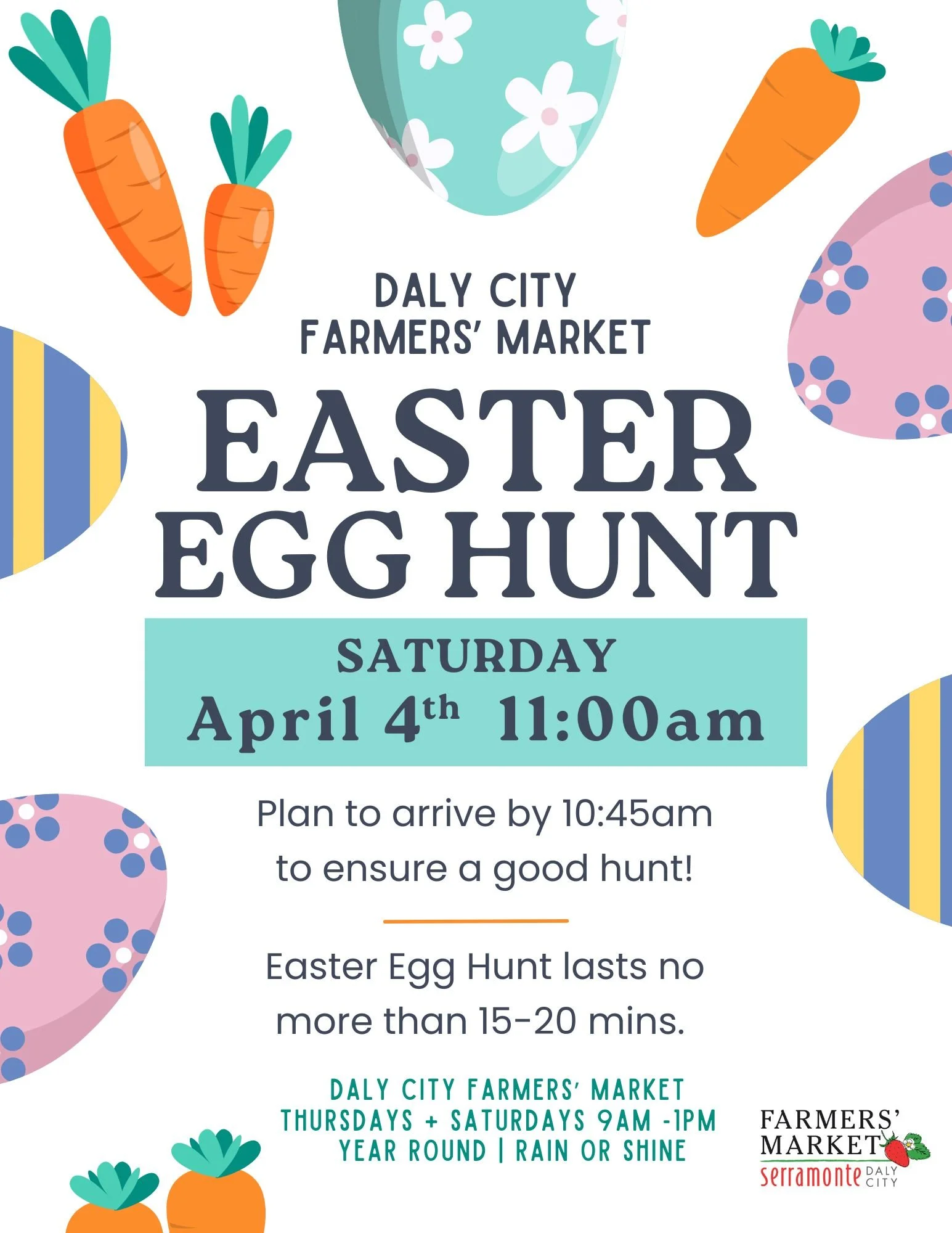 Kid's Easter Egg Hunt Sunday, April 5, 2026 11:00 AM 11:30 AM 11:00 11:30 Bayfair Farmers' Market 15555 East 14th Street San Leandro, CA, 94578 United States (map) Google Calendar ICS
