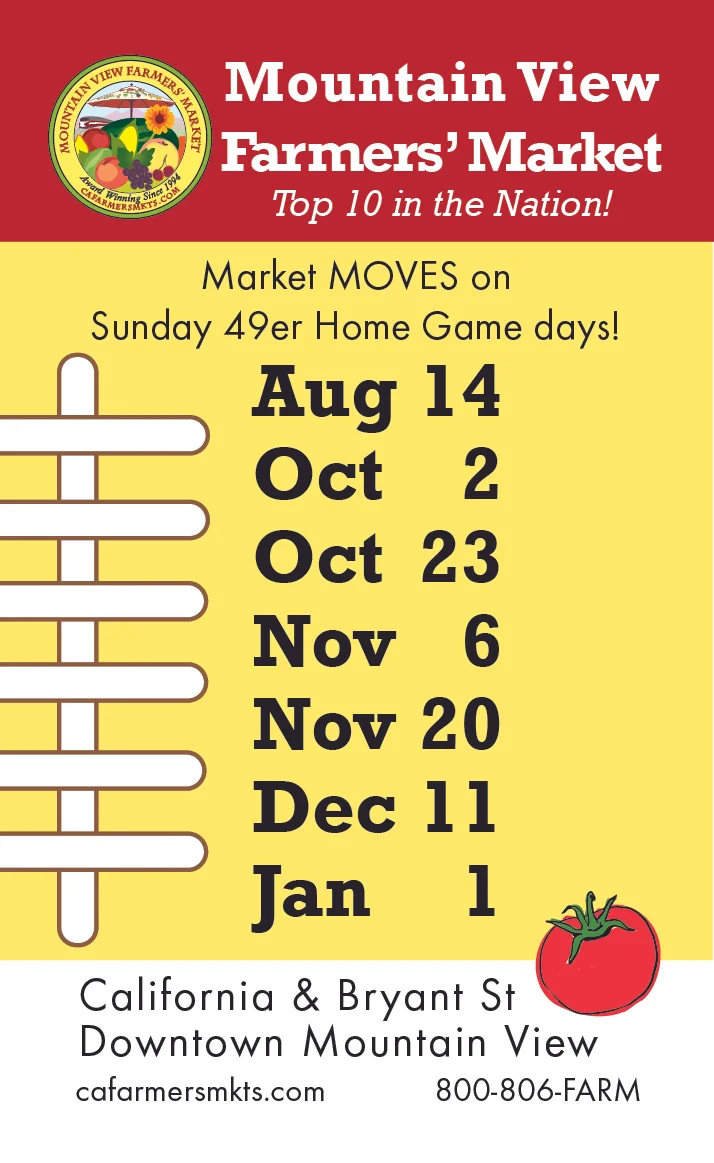 Mountain View Farmers' Market (map) California & Bryant St. Mountain View, CA ✚ gCal ✚ iCal JANUARY 1, 2017MOUNTAIN VIEW FARMERS' MARKET RELOCATES TO ALTERNATE SITE AT CALIFORNIA ST. & BRYANT ST.