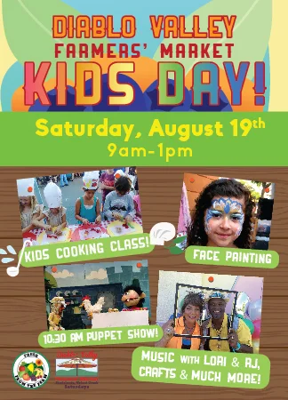 Diablo Valley Farmers' Market (map) Mitchell Drive Walnut Creek, CA, 94598 United States ✚ gCal ✚ iCal Join us for a day of family fun with family farmers! Kid's Cooking ClassMarionette puppet show at 10:30amFace paintingKid's Entertainment with Lori & RJCrafts & much more!
