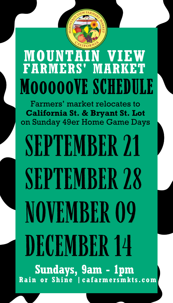Mountain View Farmers' Market Alternate Location (map) California St. & Bryant St. Mountain View, CA United States ✚ gCal ✚ iCal