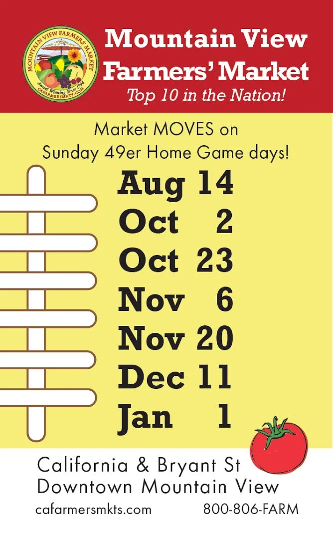 Mountain View Farmers' Market (map) California Street & Bryant St. Mountain View ✚ gCal ✚ iCal October 23, 2016Mountain View Farmers' Market Relocates to Alternative Site at California St. & Bryant St