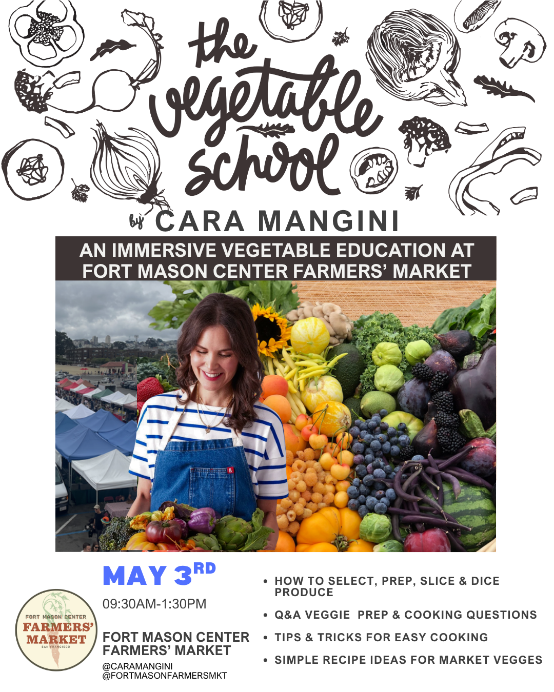 The vegetable school is a monthly event hosted by cara at the Fort Mason Farmers’ Market to share her knowledge and be a resource in the community to further our collective goal of supporting family farmers and creating a more sustainable food system!